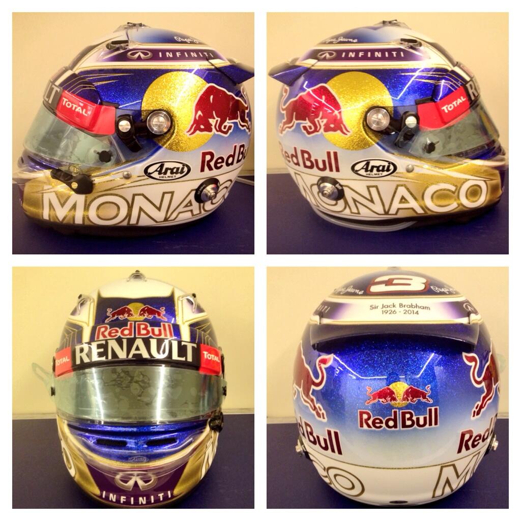 O australiano Daniel Ricciardo segue a base de desenho do capacete que a Red Bull coloca para todos os seus pilotos e adiciona um "laranjão" na base. Para Mônaco, o desenho continuou praticamente o mesmo, mas as cores mudaram. Saiu o laranja e entrou o dourado com um baita Mônaco na base. De resto tudo seguiu da mesma forma que o australiano normalmente usa durante o restante da temporada.